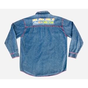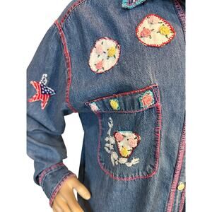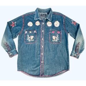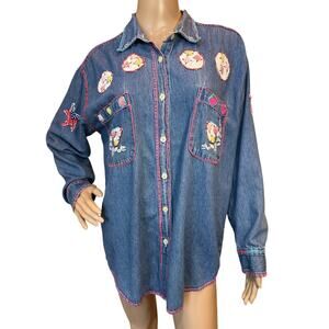 VINTAGE 90s Upcycled BOHO Embroidered Denim Button Up Jean Shirt Women SZ Large