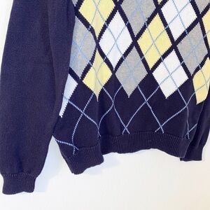 VINTAGE 90s Y2K Liz Claiborne Navy Yellow White Preppy Argyle V-Neck Cotton Pullover Sweater Size Medium