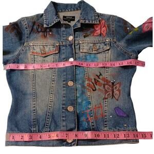 Gorgeous and unique art-to-wear jacket! Painted denim with random studs. Fun and colorful with great fade. Pretty butterfly art on front and back. A really special vintage piece.