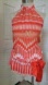 Stylish halter top featuring a vibrant contemporary modern chevron pattern in orange tan cream. Perfect for a chic and glamorous look. Sleeveless, high neck, sash ties in back with a big bow. Drop waist, sash ties around low waist hips with bow bow. Soft, luxurious silk. Measures 17" across the bust and 24" long. Excellent condition.