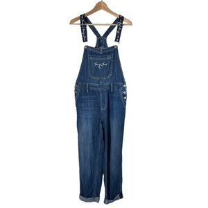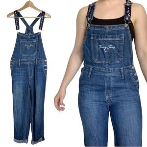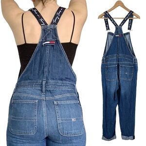 VINTAGE 90s Y2K TOMMY HILFIGER Tommy Jeans Spellout Cuffed Denim Overalls. Medium wash. Spellout ajustable straps. Embroidered bib and logos throughout. Similar style worn by Britney Spears and Beyonce in the late 90s/early Y2K eras. Sewn-in cuffs. Marked a vintage size 4. Refer to measurements for current modern fit.