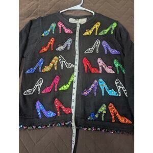 VINTAGE 90s black dressy high heel cardigan w/button front by Jane's Closet, Med mom teacher granny fancy sweater church wedding guest graduation concert Broadway play musical theater courtroom orchestra gala event red. Carpet fund raising event MC keynote speaker presentation fashion show retro kitchy graphic sweater fun fancy posh elegant dressy librarian old money