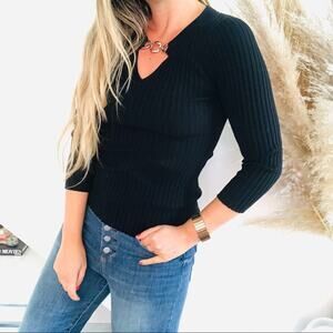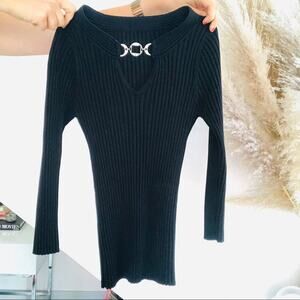 VINTAGE 90s y2k Black Fitted Ribbed Silver Keyhole Pullover Sweater XS