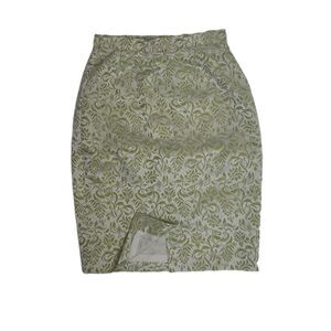 Vtg 1990s Escada Couture green botanical print jacquard brocade pencil skirt. Extra button included. Fully lined. Small pull at waistband. Marked size 36, please refer to measurements. Shown the same style but different print/color in last photo. Acetate polyester rayon.
