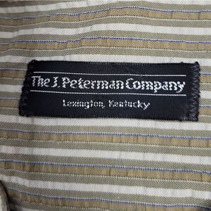 Step back in time with this vintage 1990s J Peterman striped seersucker button up shirt. The shirt features a classic striped seersucker fabric and a loose fit for a comfortable, casual look. The button up design adds a touch of sophistication, making it the perfect addition to any vintage style wardrobe. Whether you're heading to a backyard barbecue or a casual night out, this shirt is sure to turn heads. So why wait? Add a touch of nostalgia to your wardrobe today with this vintage J Peterman striped seersucker button up shirt!