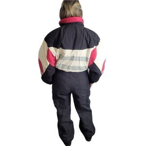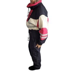Vtg 1990s Tyrolia Skiwear by Head black and pink embroidered drawstring waist snowsuit. Some mild scuffs shown in photos. Model is 5'3" and a modern size 6. This fits like a medium, please refer to measurements.
