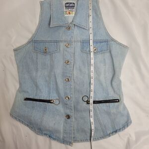 Vtg 1990s Details Express button up light wash jean fitted vest with zip pockets. Great with any outfit. Tight fit. Cotton.
