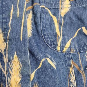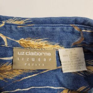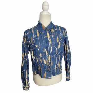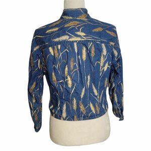 Vtg 1990s Liz Claiborne Lizwear wheat grass print denim chambray button up cropped long sleeve shirt. Small spot on the front shown in photo. Unique! Cottagecore. Fits like a small, please refer to measurements. Cotton.