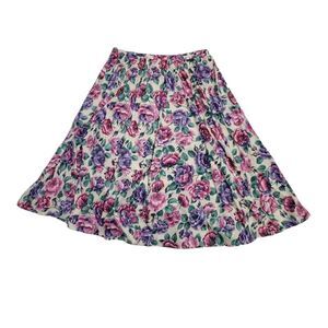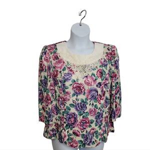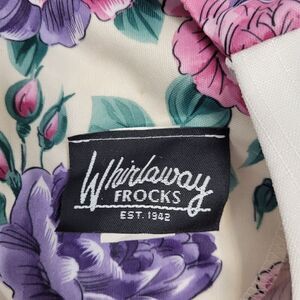 Vtg 1990s Whirlaway Frocks purple and pink floral skirt set with lace peter pan collar. Sleeves appear to be altered into a 3/4 length. Some minor faint spots shown in photos. Two piece set. Made in the USA. Polyester.