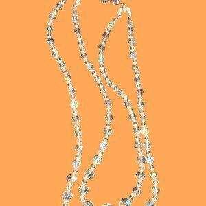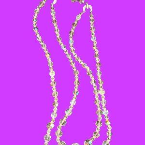 THIS GORGEOUS NECKLACE IS QUITE LOVELY! 2 STRANDS OF AB CRYSTALS & HOOK CLOSURE W RHINESTONES AROUND CLOSING ENDS. 16-18 INCHES ALONG WITH AN EXTENSION CHAIN MAKES 19 + INCHES LONG. A++++++ CONDITION.