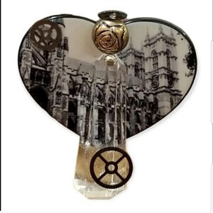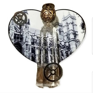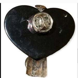 Unique pin with a crystal quartz angel with a rosary bead head and little metal gear for a halo attached to a heart with a cathedral scene. Pin measures 1-1/2 inches long and 1-5/8 inches wide. Truly unique artistic piece, I've never seen anything like it.