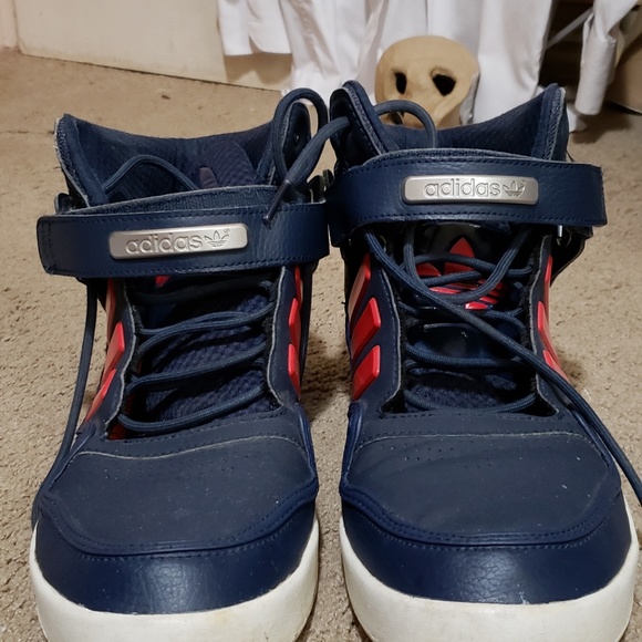 Blue leather red stripes with velcro strap across fornt of high top with metal embossed Adidas Logo on it.