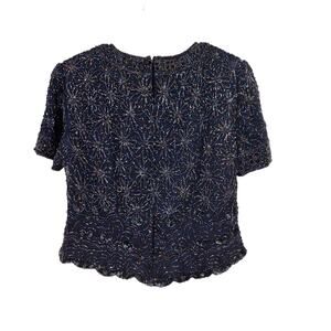 Step back in time with this stunning vintage Adrianna Papell blouse and scarf set! This exquisite set features a silk blouse adorned with delicate beading and a matching scarf to complete the look. The blouse has a flattering crew neck design, perfect for any occasion.