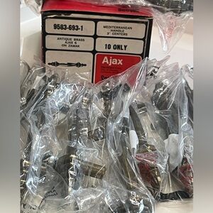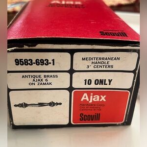 Set of 10 Mediterranean handle by Scovill. Elegant antique brass design. AJAX 6 on ZAMAX” with 3” CENTERS, 1970s ORNATE TWIST WITH CROWN ENDS, FOR FURNITURE RESTORATION AND HOME IMPROVEMENT. SPANISH REGENCY, MEDITERRANEAN STYLE, HANDLES ARE UNOPENED PACKS!