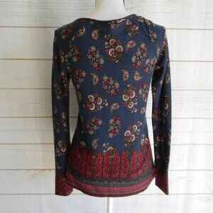 VINTAGE AMERICA WM'S WAFFLE KNIT BOHO LACE-UP DETAIL BLOUSE TOP SZ S, GOOD USED CONDITION. COOL THERMAL/WAFFLE KNIT FLORAL TOP WITH VELVET/LACE UP NECK DETAIL. MEASURES FROM ARMPIT TO ARMPIT: 18" AND FROM TOP OF SHOULDER TO HEM: 26".