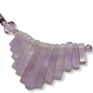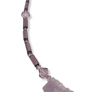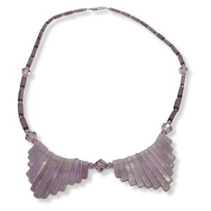 Beautiful vintage necklace with cylindrical purple glass beads and small faceted purple glass beads. They center front of necklace has beautiful amethyst crystals that create a sort of collar style design. Necklace has a silvertone box tab style closure and measures 20-1/2 inches in length. Beautiful piece in excellent condition.