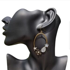 VINTAGE ANTIQUED BRASS BLUE BIRD & FLOWERS DROP HOOP STYLE EARRINGS
