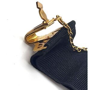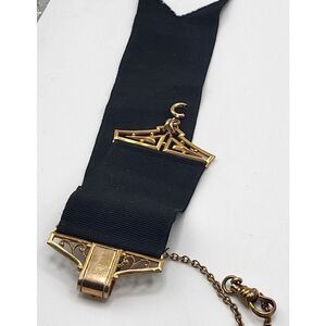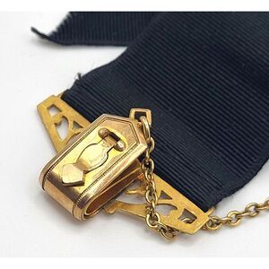 VINTAGE ANTIQUE GOLD FILLED VICTORIAN Art Deco FUNERAL POCKET WATCH Chain 6in see desc Materials: gold filled, black ribbon Length: 6in long Clasp: toggle clasp for pocket, spring ring is broken Signed? no Excellent Antique Condition - except spring ring is broken