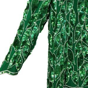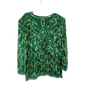 VINTAGE ANUJAN XL SILK ALL OVER BEADED FLORAL LEAF LONG SLEEVE BLOUSE