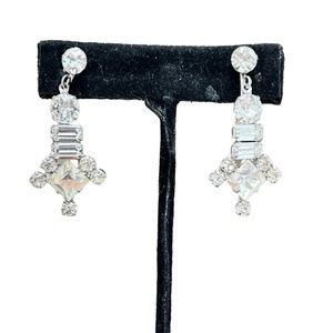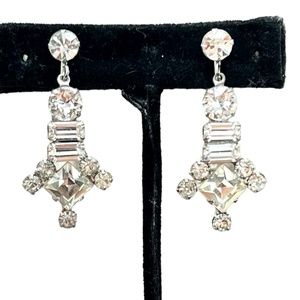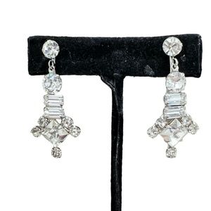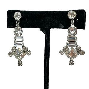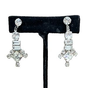 Vintage Art Deco clear rhinestone or crystal dangle earrings. Screw backs. The part that sits on the ear is a 6mm round stone. The top of the drop has a 7mm round stone. Under that are 2 horizontal 8mm x 4mm stones. At the bottom is an 8mm x 8mm square stone surrounded by 4mm round stones. The earrings are slightly darkened silver tone. In excellent preowned condition.