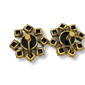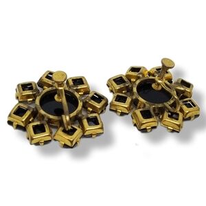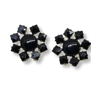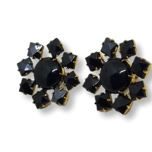 Lovely vintage art deco flower design earrings. Earrings are goldtoned and set with black glass cabachons. They measure 1-1/8 inches in diameter with screw backs. Earrings are in good condition with a little wear to the goldtone color on backside of earrings as seen in pics.