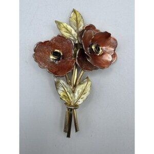 The design features two beautiful roses with intricate leaf details, all crafted in vibrant orange enamel and gold Tone. The brooch is in the shape of a flower, making it the perfect addition to any floral arrangement or bouquet.
