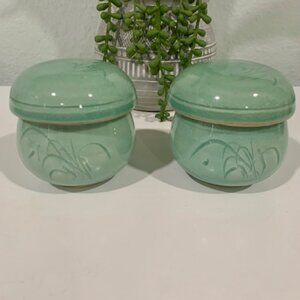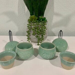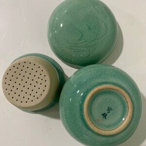 VINTAGE ASIAN CELADON COMPLETE TEACUP SET of 2 (6 pieces total)