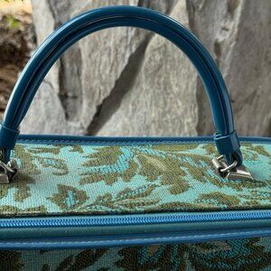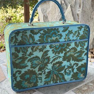 VINTAGE AVON Retro Sales Rep Blue Floral Green Tapestry Mini Suitcase 70s