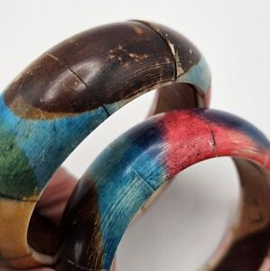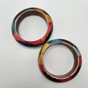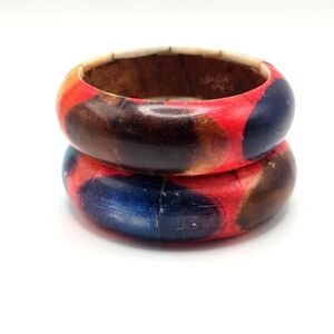 Vintage wooden bangle set with painted overlay panels in possibly acrylic. Measures a little over 2.5" across inside. Purchased from an estate and no visible makers mark (are made by Encore based on another set listed with tag attached). Natural imperfections in design to appear slightly distressed. Excellent condition and smoke-free home.