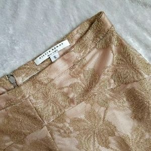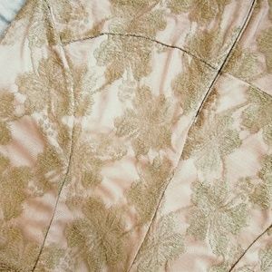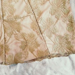 Delicate blush & gold mesh lace over nude lining; stylish allover seaming detail accentuates your curves. Slight flare at hem; hidden back zip. Comfortable knit fabric w/satiny sheen. Fiber content/care label missing, as this is a designer sample!