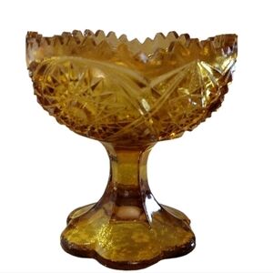 Vintage John E. Kemple Amber Glass Compote Bowl with sawtooth edge, scalloped pedestal with an atomic starburst pattern. In pristine condition.