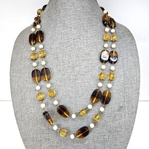 VINTAGE Amber Glass & Faux Pearl Double Strand Chunky Necklace