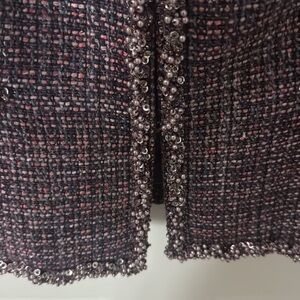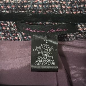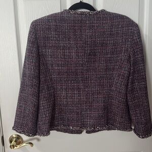 Purple and pink tweed blazer with beating Detail from Andrea Behar in size 12. Beading is around collar and down on all seams. Clip front hidden closure. Excellent condition. Smoke-free home.