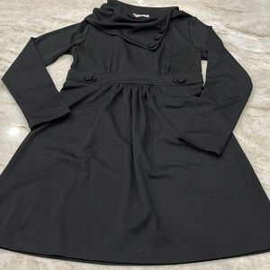 Dark, moody, and unmistakably vintage—this Aryeh midi dress channels serious Bettie Page energy with a gothic twist. Made from a weighty poly blend, it features a draped cowl neckline with button accents, long sleeves, and an empire waist detailed with fabric-covered buttons. The silhouette is softly structured, feminine, and just a little dangerous.