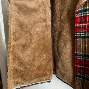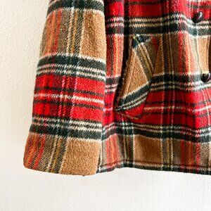 This is a stunning and authentic mid-century men’s wool plaid car coat, made between 1956 and 1962 under the Deluxe Quality Outerwear label. A true example of postwar Americana, this coat features a bold red, tan, and green tartan wool shell, luxurious faux shearling lining and collar, and classic woven leather “football” buttons — all hallmarks of 1950s men’s outerwear design.