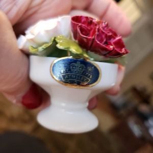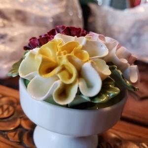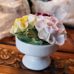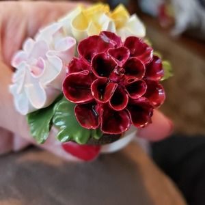 This charming floral basket, would make a perfect gift for someone special or accent piece in the home. With it's delicate pretty floral pattern and beautiful cluster of colourful vibrant flowers each flower and leaf is handmade and hand painted. Measures approximately 3" H, 2” W of base.