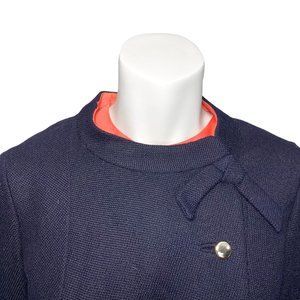 - Blazer has a textured wool blend material, asymmetrical front button closure, neckline bow detail, and a boxy fit