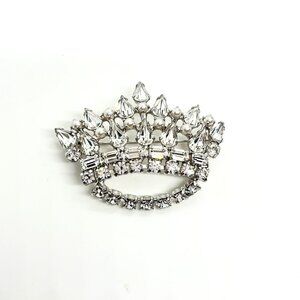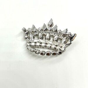 Beautiful vintage B. David crown brooch featuring a regal tiara / crown design with sparkling clear rhinestones and delicate faux pearls set in silver-tone metal. The mix of pear, baguette, and round-cut stones creates a brilliant multi-dimensional shimmer that catches the light from every angle. Signed David on the reverse. Measures approximately 2" wide by 1.5" high. Great vintage condition with light surface wear consistent with age, but does not detract from wear or the beauty of this stunning statement crown pin — a timeless piece for collectors or elegant evening wear.