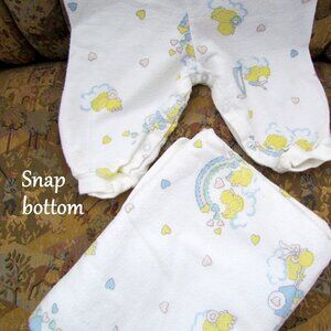 This classic flannel onesie and blanket were made by a well-known seamstress called "The Baby Lady." I bought these in 1990, and have kept them because she made them with love and skill. See the white covered snaps at the top. There are also snaps for ease in changing your baby. The neck, wrists, and ankles have stretch cotton ribbing. The 2-layer blanket is white on the lower side, with the white, yellow, and blue print on the top.