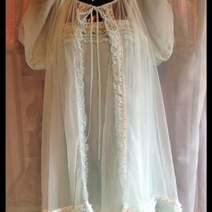 HTF RARE BABY DOLL DUO: baby blue spaghetti strap gown with 4 rows of ruffles and lace to top it off. The peignoir has puffy sleeves with 4 rows of ruffles at the bottom, a single row of ruffles along the front edge and lastly an extra long ties for closure. This is in a like-new unworn condition. MARKED DOWN