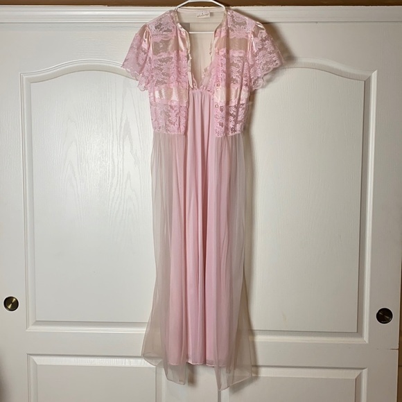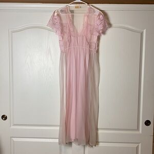 EUC. Rare matching robe & slip dress set. Brand is Slumbacraft. Robe is sheer with a lace top. Comes with tie. Union made in USA. Tag reads size large, fits more like medium.