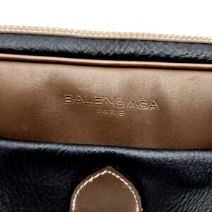 VINTAGE BALENCIAGA BLACK AND BROWN LEATHER TOILETRY BAG/MAKEUP BAG. Gold-Tone Hardware. Front pouch with push clasp. Top zipper closure. Inside pocket. Bag is in good condition. Minor discoloration on the hardware. See picture. Inside of bag is clean. Strap is in good condition.