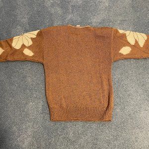 Dressy ladies' vintage sweater in light brown and cream decorated with pearls, sequins, beads and angora. Size is not marked but the sweater appears to be a large. Armpit to armpit measures approximately 18 inches. Length from shoulder to bottom is 25 inches. Excellent condition. Perfect for a dressy evening or cozy after ski dinner.