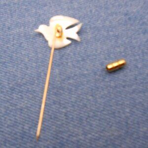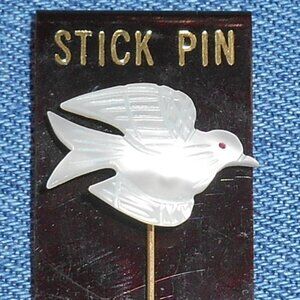 VINTAGE BIRD DOVE IN SHELL ON GOLD TONE STICK LAPEL PIN ON ORIGINAL DISPLAY CARD