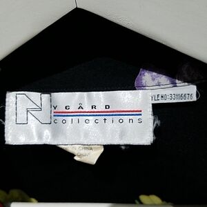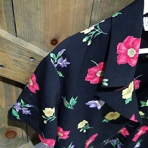 Nygard collection no rips or stains vintage black floral blouse with three buttons down the front and a snap gorgeous yellow red and purple flowers floral print throughout collar, short sleeve, great with high rise jeans or slacks pants, no size tag measures 21 inches across the chest when laying flat estimated as large, 100% polyester, dress up or down, try with high waist shorts, cropped just a bit