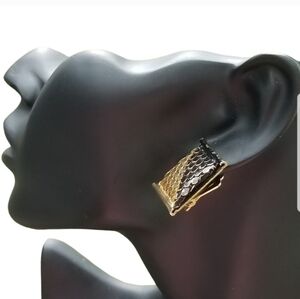 Gorgeous clip on earrings from the 60s with a half gold and half black mesh design. Earrings are clip on style and measure 1 inch long and 3/4 inch wide. Earrings in good condition.