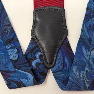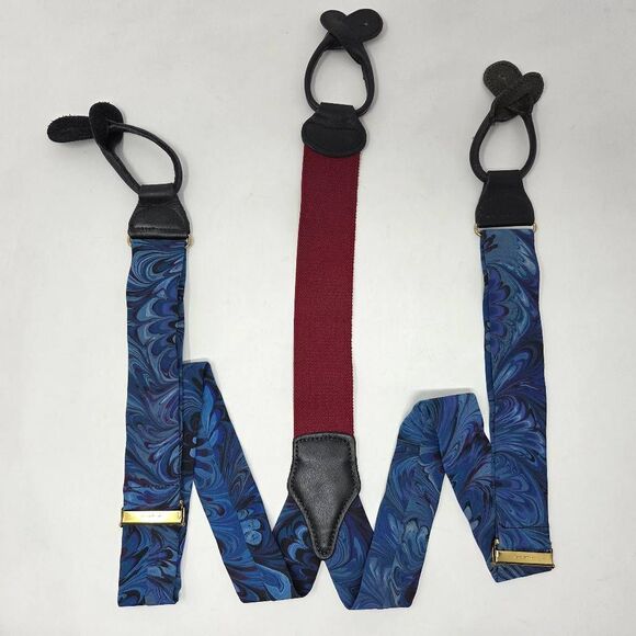 VINTAGE BLACK LEATHER BRASS MAROON MARBLED SILK ADJUSTABLE SUSPENDERS BRACES