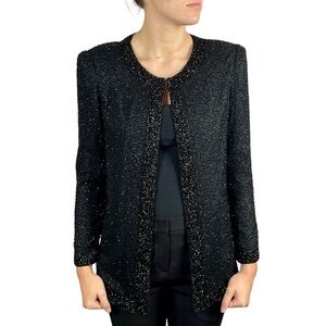 DETAIL: SHOULDER PADS. COLLARLESS. LONG LINE JACKET. FULLY LINED. LONG SLEEVES. BEADED BANDING. HOOK AND EYE CLOSURE PLACKET.