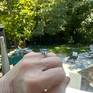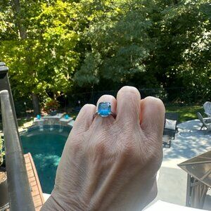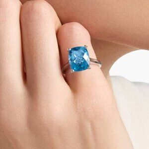 VINTAGE BLUE NILE (RETIRED) BLUE TOPAZ RING IN 925 SILVER SIZE 6 APPROX 4.68 CARATS- SET IN A "CUSHIONED" SETTING. TIMELESS AND CLASSY AS A COCTAIL RING OR EVERYDAY SHOWPIECE.