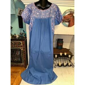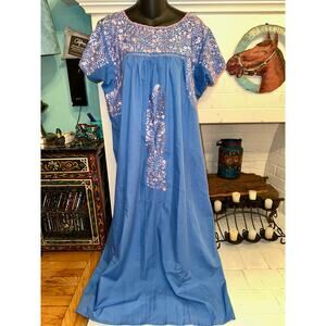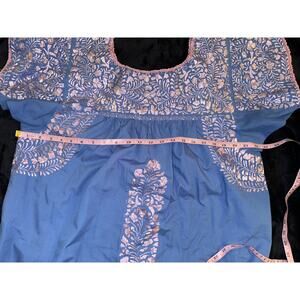 GORGEOUS COLORS (CORNFLOWER BLUE AND A LAVENDER-Y PINK) EMBROIDERED PEASANT MAXI DRESS. NO LABELS, PROBABLY HANDMADE, BUT MEASUREMENTS ARE IN PHOTOS. SIMILAR TO MI GOLONDRINA AND SAN ANTONINO DRESSES.